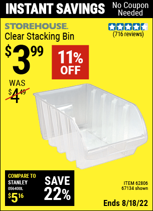 STOREHOUSE Clear Stacking Bin - Item 67134 / 62806 - Harbor Freight Coupons Compare our price of $2.99 to STANLEY at $5.16 (model number: 056400L). Save 42% by shopping at Harbor Freight. Specifications STOREHOUSE Clear Stacking Bin for $2.99 Exp. 11/3/2022 Shop Now for Item 67134 STOREHOUSE Clear Stacking Bin - Item 67134 / 62806